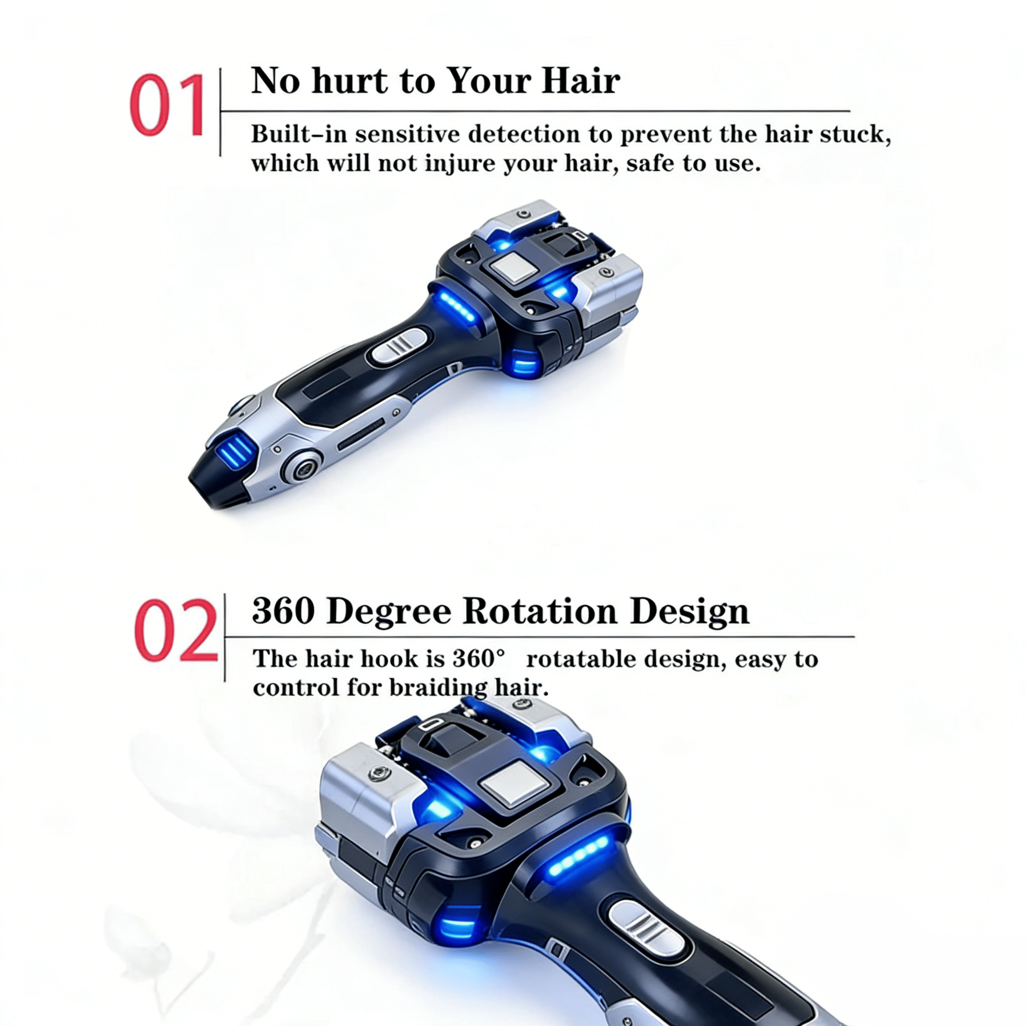 The braiding head rotates smoothly in both directions, with a sensitive detection system that prevents tangling and ensures a clean, consistent braid every time.
